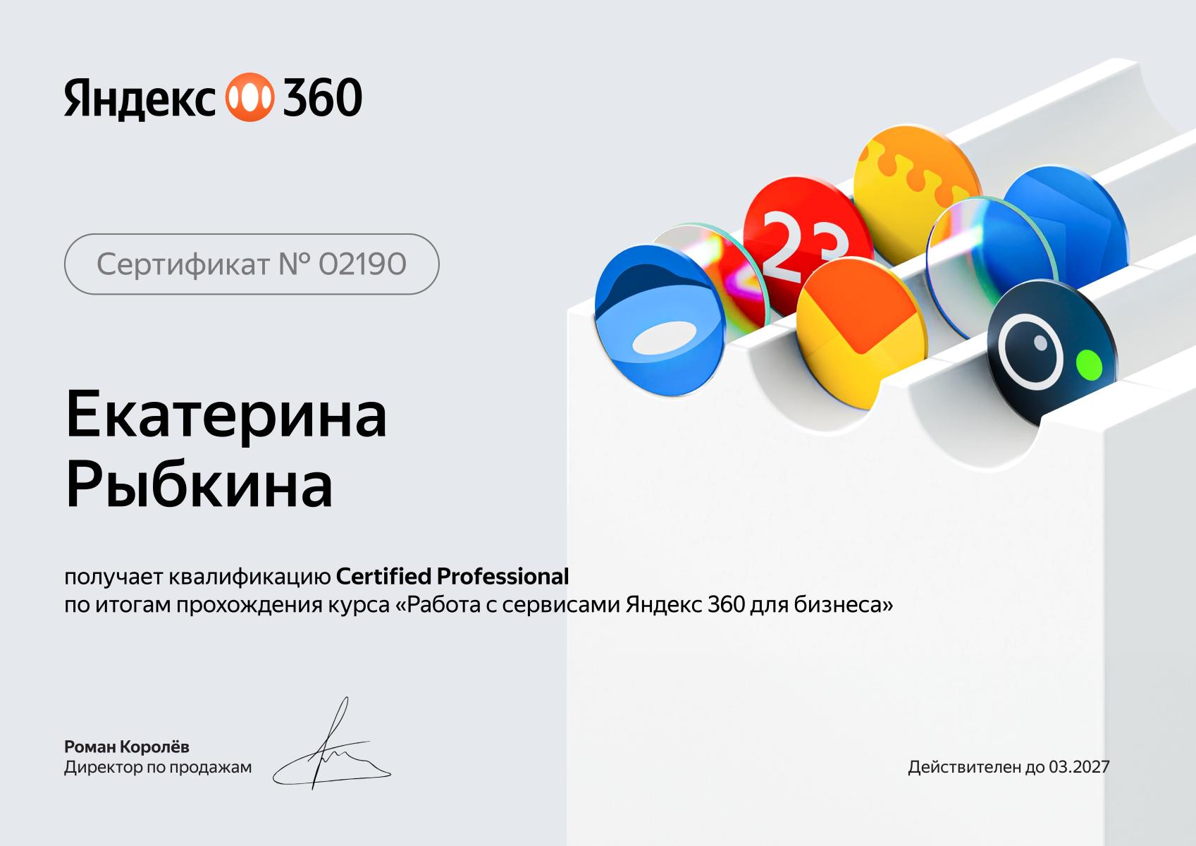 Екатерина Рыбкина – сертификат Яндекс 360